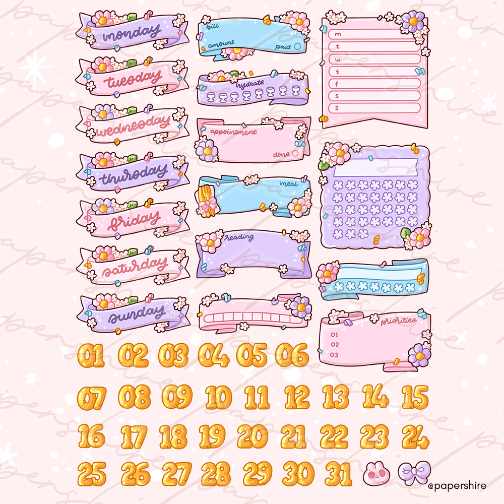 Includes 18 doodles 30 functionals, 40 day and dates, 2 washi strips and a wallpaper measuring 3842x2160px.